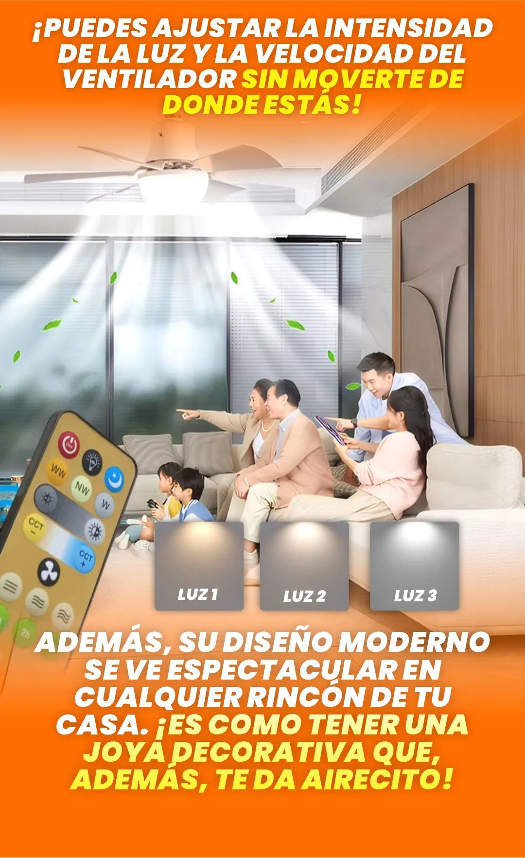 Sí, puedes ajustar las tres velocidades del ventilador y regular el brillo de la luz a través del control remoto. También es posible cambiar la temperatura del color según tus necesidades.