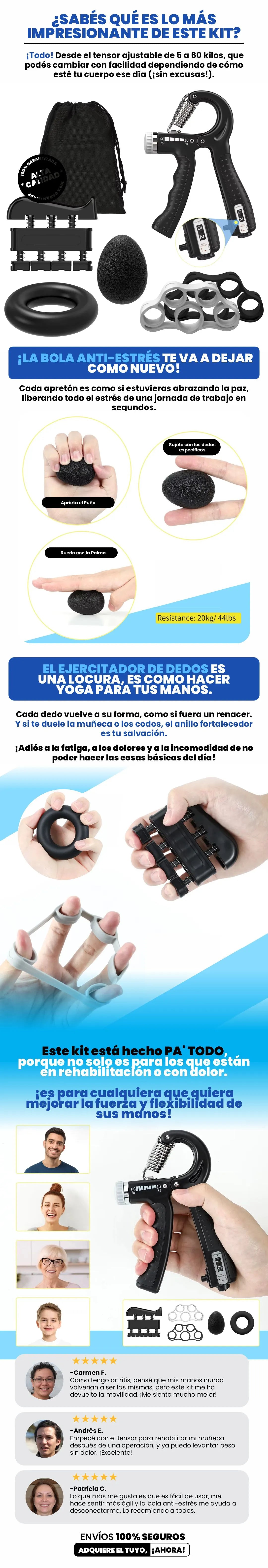 Sí, el FuerzaMax® Grip Kit está diseñado para ser seguro y cómodo para personas con artritis y dolor articular. Puedes ajustar la intensidad para empezar despacio y aumentar gradualmente según tu progreso.