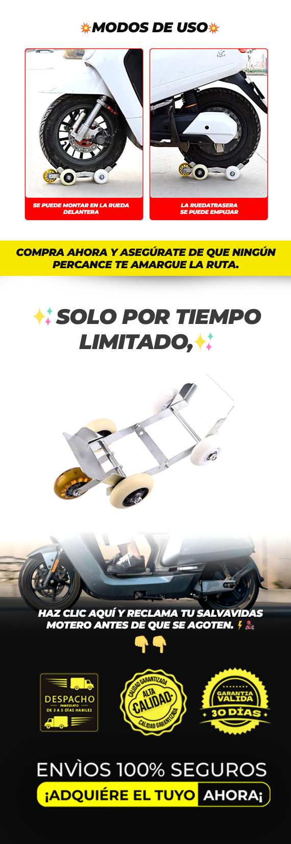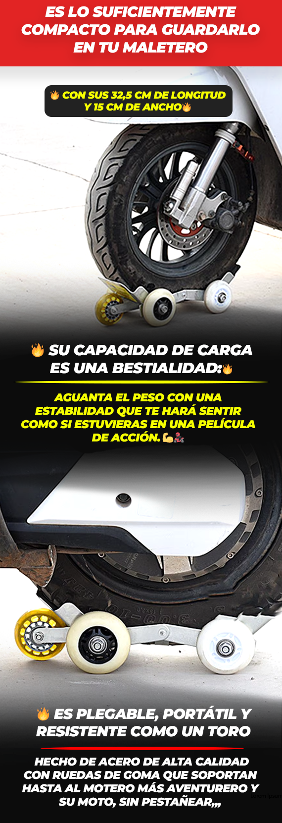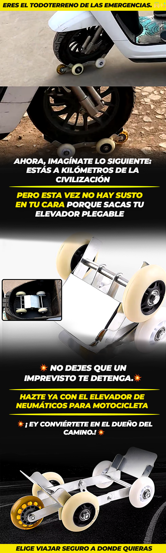 Este elevador está diseñado para soportar un peso fuerte, ideal para ayudarte en situaciones de emergencia. Aunque la capacidad exacta depende del modelo de tu moto, está hecho para aguantar con firmeza lo que le pongas