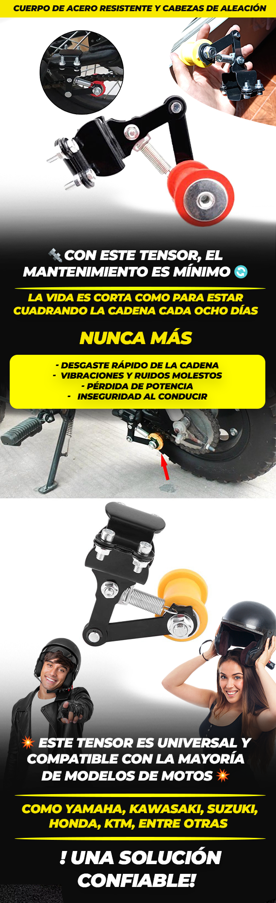 ✔️ ¡Claro! Este tensor es universal y se adapta a la mayoría de las marcas como Yamaha, Suzuki, Honda, KTM y muchas más.