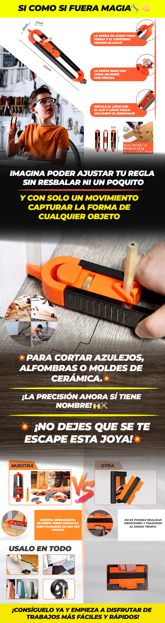 Muy preciso. Gracias a su diseño de doble extremo (polea para suavidad y puntero para detalles), puedes capturar perfiles con gran exactitud, garantizando un trabajo sin errores.