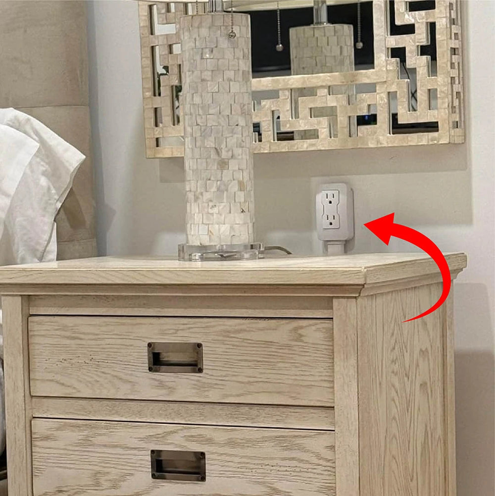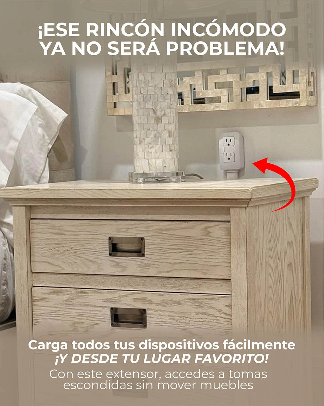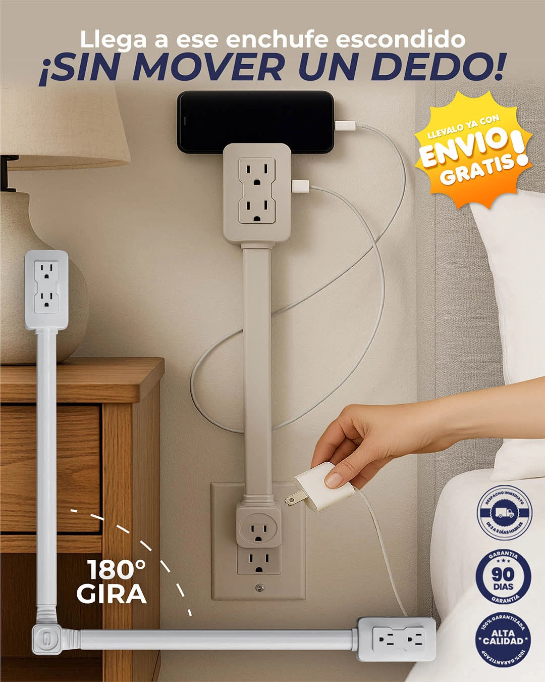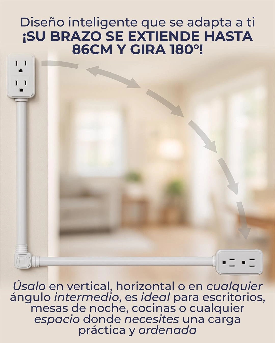 Sí. Su brazo se extiende de 22” a 34” y gira 180°, lo que permite adaptarlo a distintos espacios: detrás de sofás, mesas de noche, escritorios, cocinas o incluso camas con base alta.