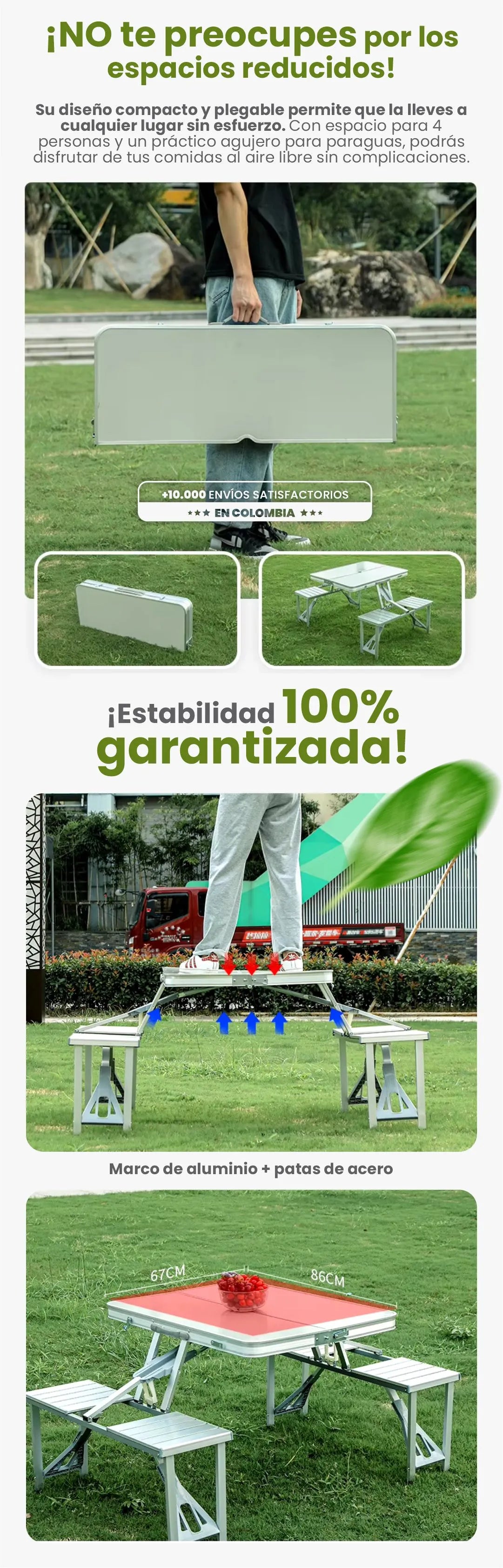La mesa plegable es ideal para hasta 4 personas, lo que la hace perfecta para picnics familiares, asados con amigos o cualquier reunión al aire libre. ¡Tienes suficiente espacio para disfrutar cómodamente!