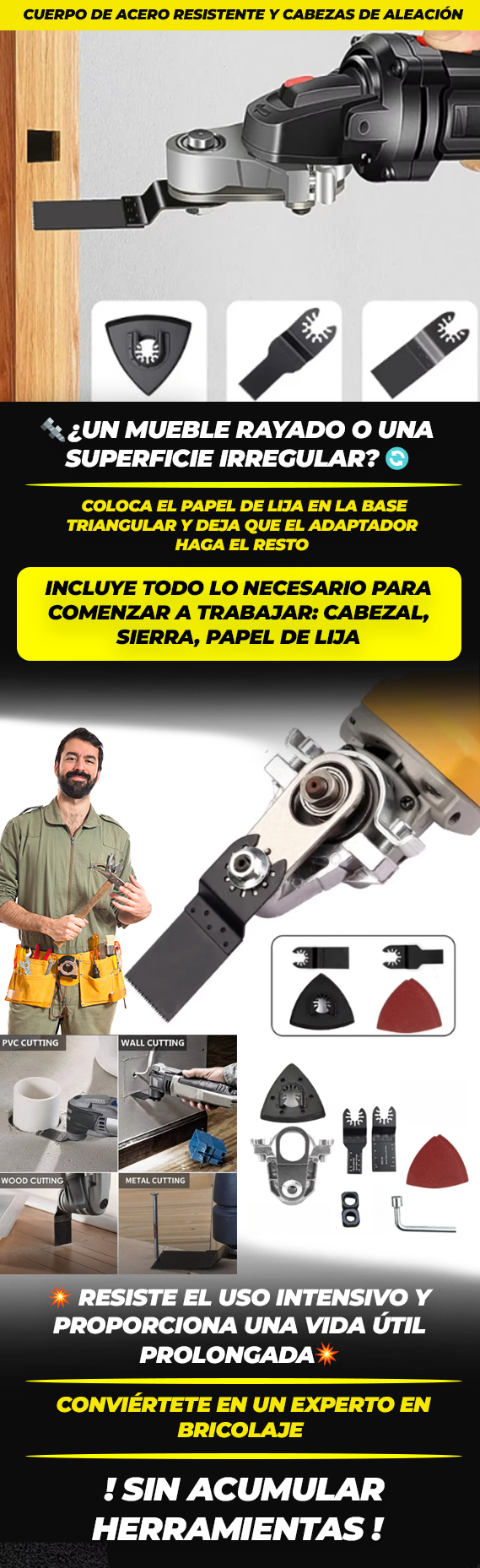 Puedes cortar, lijar y trabajar en madera, plástico, metal, y drywall (pared seca)