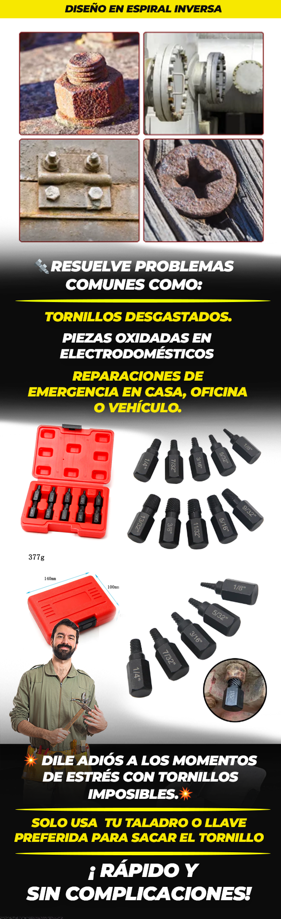 ¡Claro que sí! Su diseño en espiral inversa asegura un agarre firme, incluso en los tornillos más deteriorados.